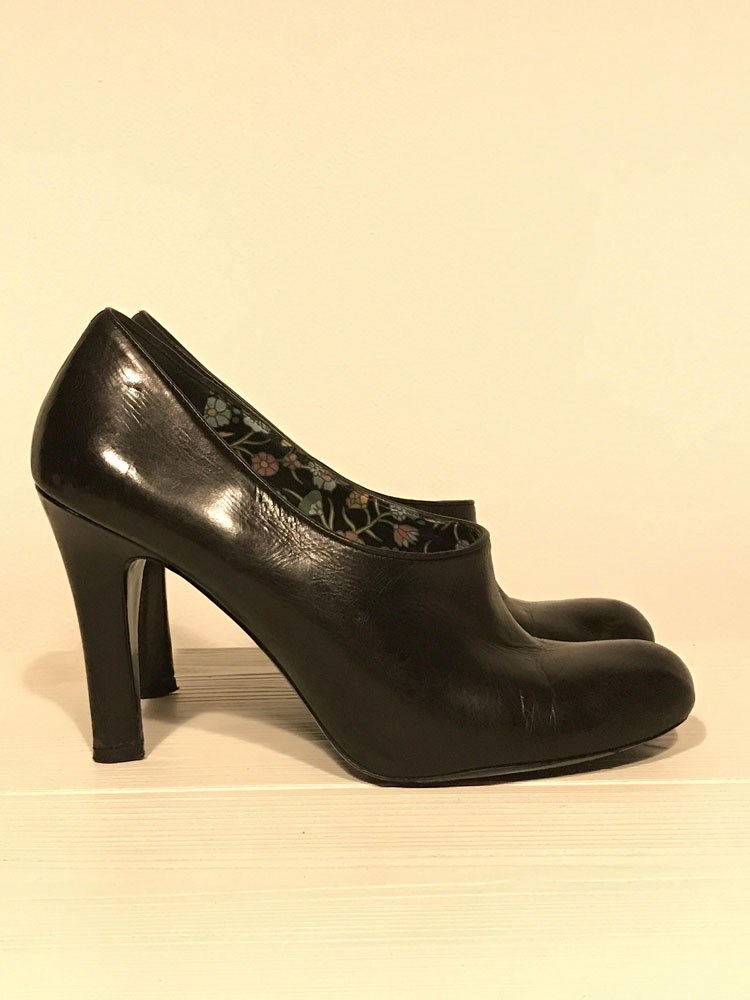 Calzatura in pelle nera con interno a fiori, forma riconoscibile Marc Jacobs.